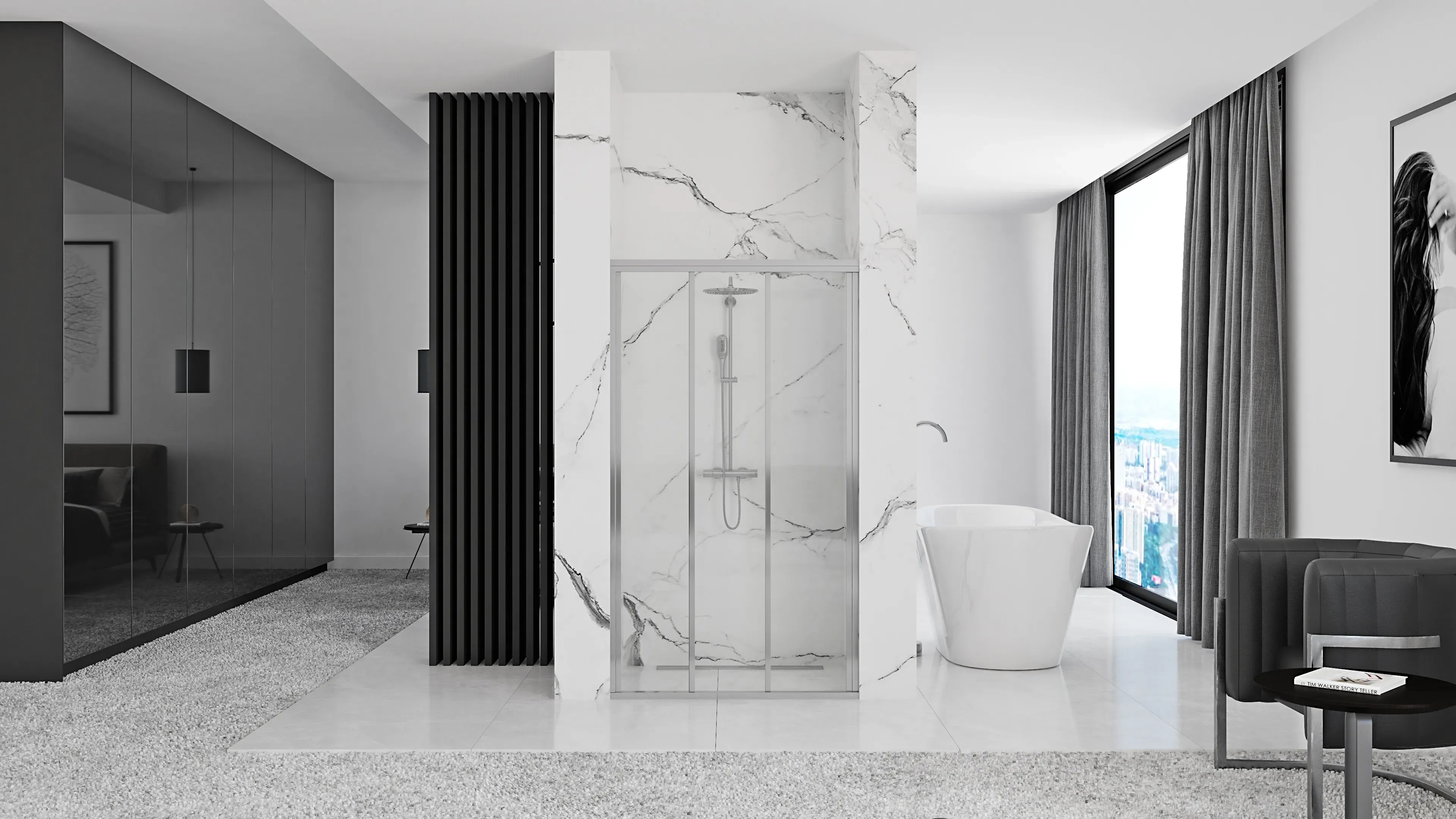 Modelul "Alex" se distinge prin designul său unic, constând într-un element fix și două elemente glisante, ceea ce maximizează spațiul disponibil și facilitează accesul. În mod implicit, direcția de deschidere a ușii este spre dreapta, însă pentru a se adapta la diferitele configurații ale băii și preferințele personale, ușa poate fi ajustată pentru a se deschide spre partea stângă. Acest lucru se realizează printr-o procedură simplă: în elementul extrem de mobil, care dispune de o bandă proeminentă ce funcționează ca mâner, este necesar să deșurubați profilele verticale și să le mutați pe cealaltă parte a geamului. Această flexibilitate asigură că ușa "Alex" se poate integra armonios în orice design de baie, oferind în același timp ușurința de utilizare și adaptabilitate.